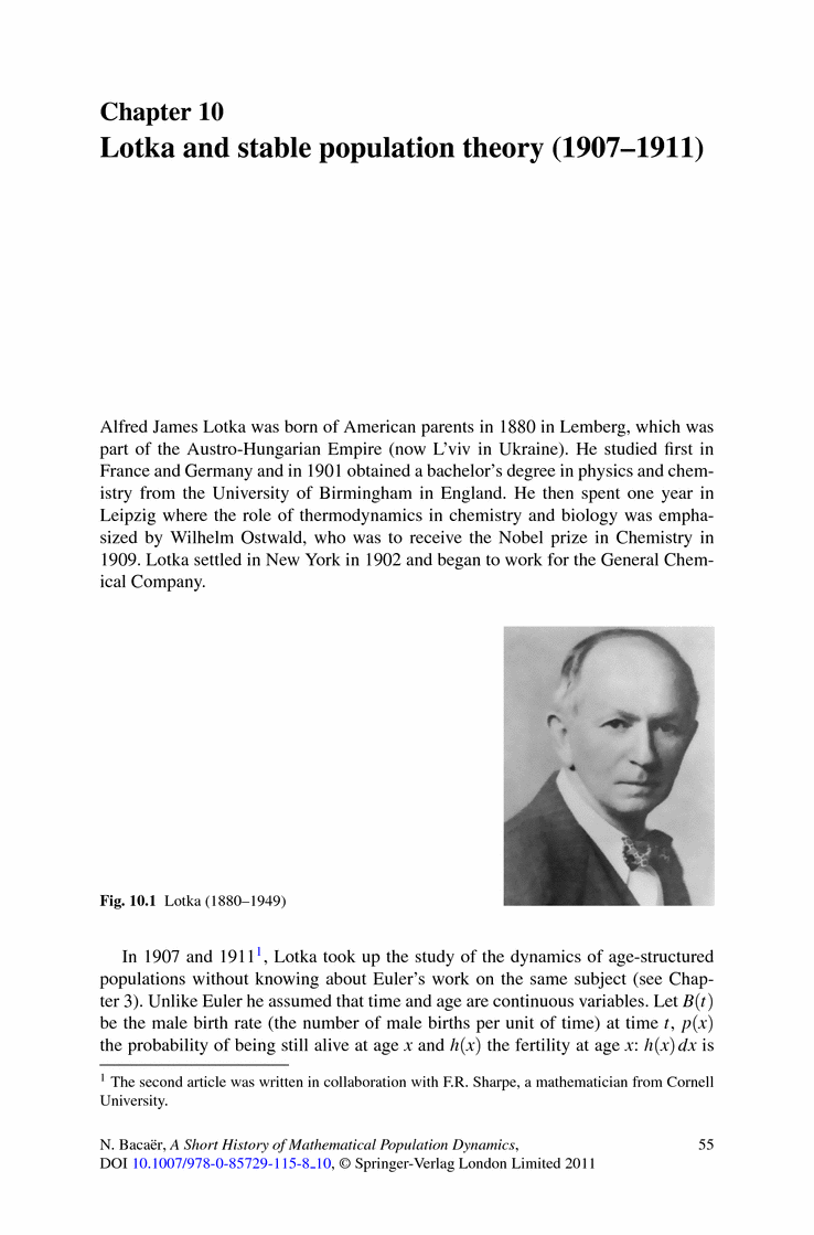 Lotka’s son Alfred Jams Lotka was a distinguished mathematician. He was born in 1880 in Lemberg, located at that time in Austria, and now in Ukraine (Lviv or Lvov). He studied physics and chemistry at the University of Birmingham and then in Leipzig, where a “center of the new field of physical chemistry, a union of physics and chemistry emphasizing the use of thermodynamic principles in chemical systems” [Kingsland, 1995] had recently been created. He studied physics at Cornell University and became assistant in that field. In 1912, he obtained a D. Sc. in science from the University of Birmingham. Thanks to Raymond Pearl, who was interested by “his mathematical and demographic approach to biological systems”, he was linked with the Department of Biometry and Vital Statistics at Johns Hopkins University, but without any salary. In 1924 he was appointed as supervisor of Mathematical Research and as General Supervisor of the Statistical Bureau at the Metropolitan Life Insurance Company in New York. From 1934 to his retirement in 1947 he served in the Metropolitan Life Insurance Company as assistant statistician. He died very soon after his retirement, in December 1949.