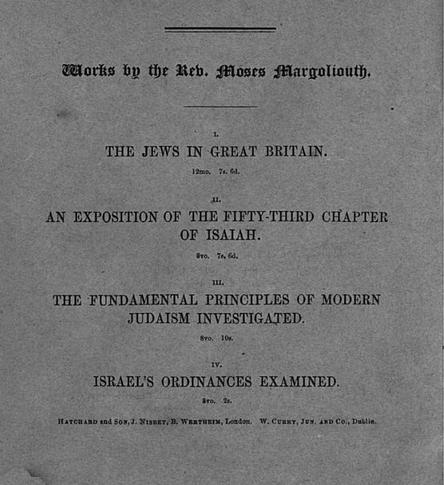 Moses Margoliouth (1815–1881) was a scholar and Jewish convert to Christianity. He became a minister in the Church of England. Alongside Elieser Bassin, he was also one of the first proponents of British Israelism to be of Jewish descent. He published History of the Jews in Great Britain (1851) and Vestiges of the Historic Anglo-Hebrews in East Anglia (1870).