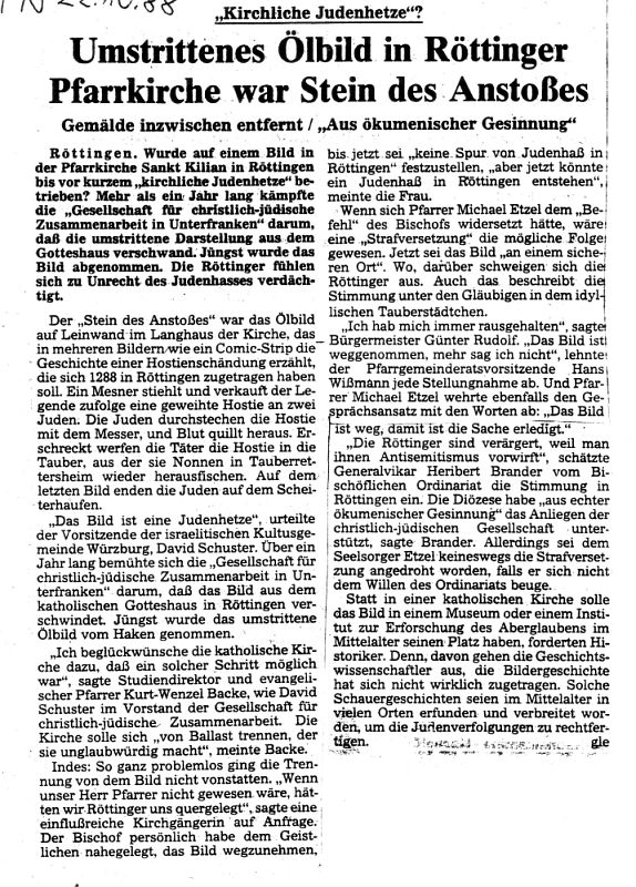 In Roettingen, 21 Jews are said to have been killed on this day by Rintfleisch and his banner-waving mob. They then moved on to other towns in the Tauber River Valley on the way to Nuremberg. Even after King Albert returned to his throne and called for peace, the killings did not immediately subside.