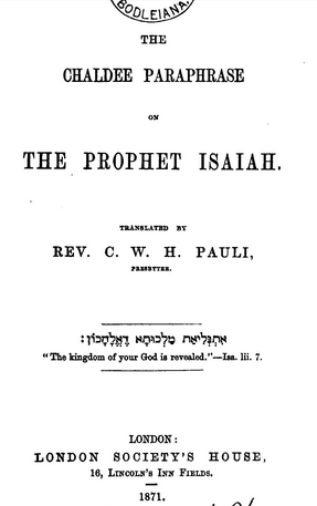 - 1871 The Chaldee Paraphrase on the Prophet Isaiahof Jonathan ben Uzziel translated by C.W.H. Pauli. – Targum Isaiah.