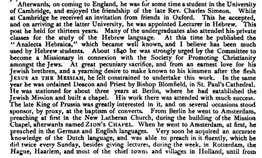 Biography: Zebi Nasi Hirsch Prinz in German Heinrich Prinz, and later Rev. Christian William Henry Pauli was a convert to Christianity, missionary for the London Jewish mission, and Hebrew grammarian. He was born as the youngest of six children, and orphaned at 14. Although he is referred to as “Rabbi Tzvi Nassi” in some Messianic Jewish reprints of his proof of the Trinity from the Zohar, there is no indication that he was ever a rabbi. At the age of 21 he published in German, under the name Heinrich Prinz Sermons for pious Israelites. He was converted by L. A. Petri. In England as Rev. Christian William Henry Pauli he became a missionary for the London Society for promoting Christianity among the Jews of Joseph Frey, first in Berlin, then at Amsterdam. In 1839 as C. W. H. Pauli he published Analecta Hebraica, a Hebrew grammar. It is frequently incorrectly claimed that Pauli was a lecturer in Hebrew at Oxford University, but he was never a member of Oxford or any other university. In 1844 as Rev. Christiaan Wilhelm Hirsch Pauli he moved to the Netherlands, Zion’s Chapel where he worked for 30 years. In 1844 he reported on an outrage committed on the Jews at Weesp, near Amsterdam. Show Less