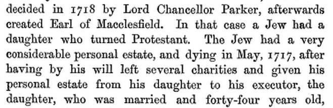 In Great Britain an “Act to oblige Jews to maintain and provide for their Protestant children” took effect. This act of Parliament grew out of case involving Jacob de Mendez Berta and his daughter Mary who became a Protestant. According to one source, the father refused to continue to support his daughter after she converted and her newly adopted Protestant community did not want to shoulder the burden of her support. Hence, this legislation was adopted and would stay in effect until the middle of the 19th century.
