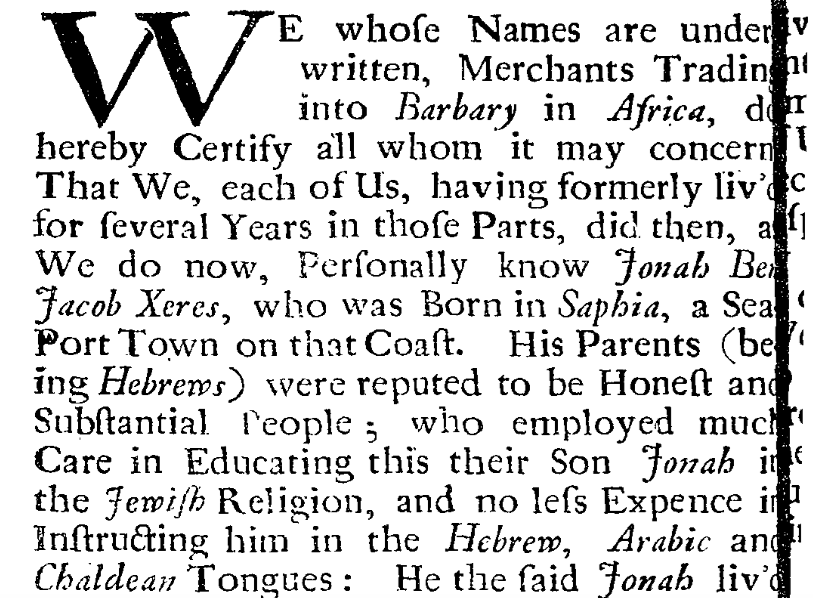 “We, whose names are underwritten, merchants trading into Barbary in Africa, do hereby certify, all whom it may concern, that we, each of us, having formerly lived for several years in those parts, did then, as we do now, personally know Jonah ben Jacob Xeres, who was born in Saphia, a sea-port town on that coast. His parents, being Hebrews, [526] were reputed to be honest and substantial people; who employed much care in educating this their son, Jonah, in the Jewish religion, and no less expense in instructing him in the Hebrew, Arabic, and Chaldean tongues.