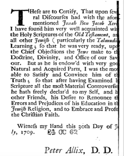 “These are to certify, that upon several discourses had with the aforementioned Jonah ben Jacob Xeres, I have found him very well acquainted with the Holy Scriptures of the Old Testament, and all other Jewish and particularly Talmudical learning; so that he was very ready, upon the chief objections that Jews make to the doctrine, deity, and office of our Saviour. But, as he is endowed with very good natural and acquired parts, I was the more able to satisfy and convince him of the truth; so that, after having examined by Scripture all the most material controversies, he hath freely declared to myself, and his other friends, his desire to renounce the errors and prejudices of his education in the Jewish religion, and to embrace and profess the Christian faith.