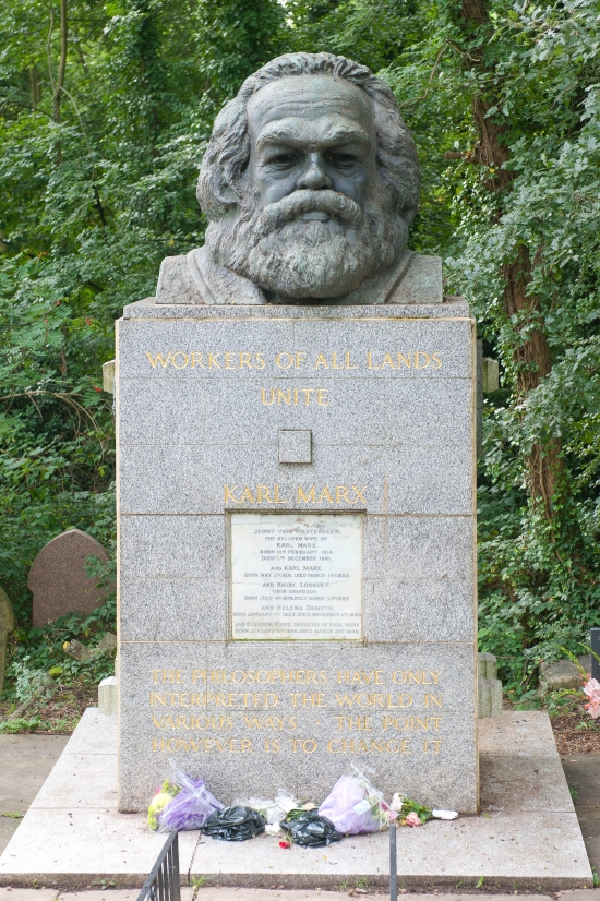 Marx’s excessive smoking, wine drinking, and love of heavily spiced foods may have been contributing causes to his illnesses. In the final dozen years of his life, he could no longer do any continuous intellectual work. He died in his armchair in London on March 14, 1883, about two months before his sixty-fifth birthday. He lies buried in London’s Highgate Cemetery, where his grave is marked by a bust (sculpture of a person’s head and shoulders) of him.
