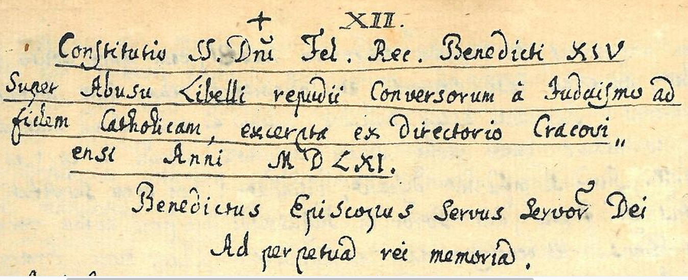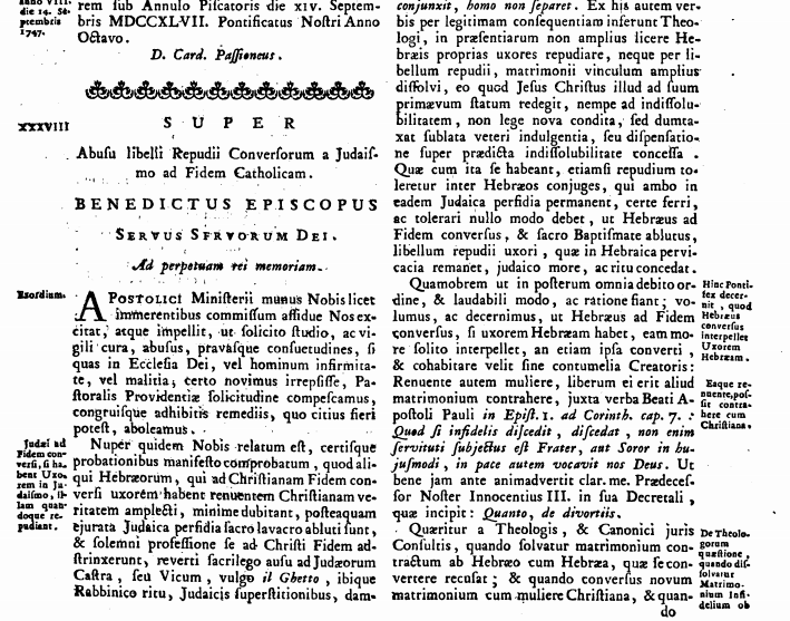 APostolici Ministerii munus Nobis licet immerentibus commissum assidue Nos ex citât atque impellit, ut sollicito studio, ac vigili cura abusus pravasque consuctudines siquas in Ecclesia Dei, vel hominum infirmitate vel malitia, certò novimus irrepsisse Pastoralis Providentiae sollicitudine compescamus congruisque adhibitis remediis, quo citius fieri potest, aboleamus. Nuper quidem Nobis relatum est, certîsque probationlbus manifesté comprobatum quod aliqui Hebratornm, qui ad Christianam Fidem conversi uxorem habent renuentem Christianam veritatem amplecti, minime dubitant, posteaquam ejuratá Judaicá perfidiâ sacro lavacro abluti sunt solcmni professione se ad Christi Fidem adstrinxerunt reverti sacrilego ausu ad Judscorum Castra, feu Vicum, vulgò il Ghetto, ibique Rabbinico ritu, Judaicis superstitionibus damnaiidisque observationibus libellum repudii uxoribus concedere, vel etiam extra Judarorum domicilium cWam Notario Testibufque Christianis cumdem libellum repudii uxoribus da re, ut liberam eis nubendi alteri Viro potestatem faciant. Moyfes quidem in Deuteronomio cap. 24. ita scriptum reliquit Si acceperít bomo uxorem babuerit eam non invenerit gratiam ante oculos ejus propter aliquam feedita