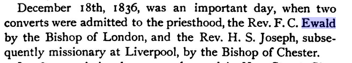 December 18th, 1836, was an important day, when two converts were admitted to the priesthood, the Rev. F. C. Ewald by the Bishop of London, and the Rev. H. S. Joseph, subsequently missionary at Liverpool, by the Bishop of Chester.