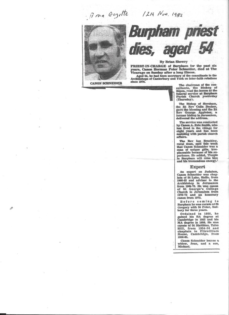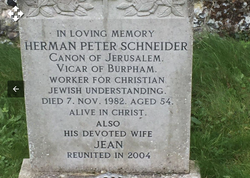 Canon Herman Peter Schneider (1928-1982) was born of Jewish parents in Czechoslovakia. He came to England at the age of 10 as a refugee from Nazi persecution. He was subsequently brought up as a Christian and ordained in the Church of England in 1954. Following a London curacy, he became chaplain at Fitzwilliam College, Cambridge. In 1960, he went to Israel as chaplain to St Luke’s, Haifa. In 1964, he became Adviser to the Anglican Archbishop in Jerusalem in Jewish-Christian Relations, pioneering dialogue and mutual understanding between Jews and Christians beyond the bounds of his own denomination, In 1973, he returned to England and continued this work through the Church of England and numerous ecumenical organisations while serving in parishes in Suffolk and Sussex.