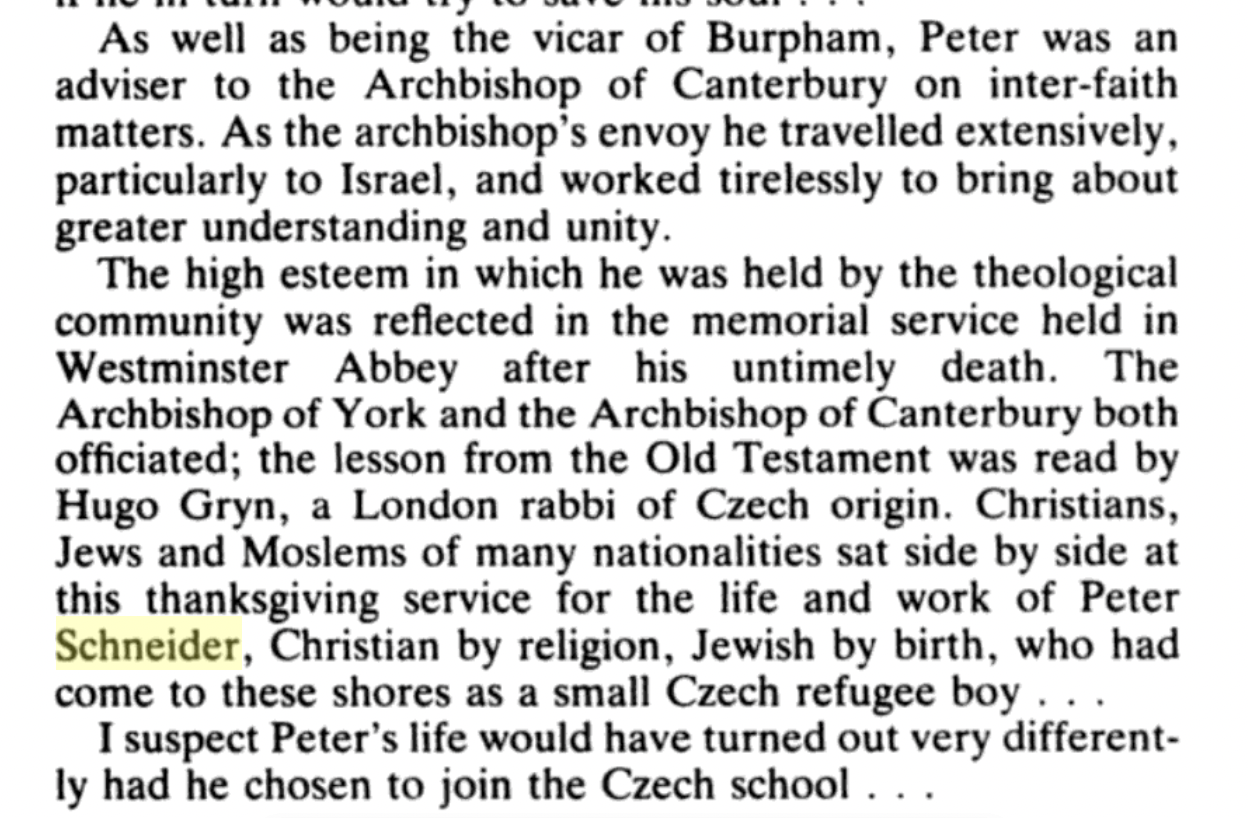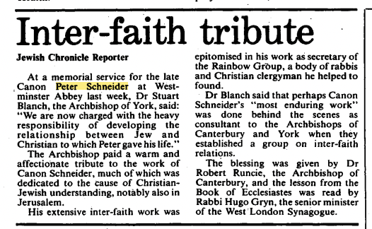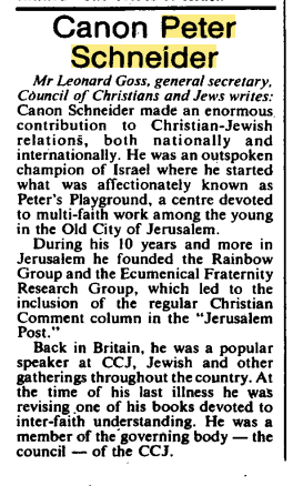 Many other names should be recorded here: Rev. Peter Schneider, Canon of the Anglican Church who worked for mutual understanding and reconciliation between Jews and Christians both in Israel and Britain. He founded the Jerusalem and London Rainbow Groups as well as the Ecumenical Theological Research Fraternity in Israel. He was secretary to the advisers of the Archbishops of Canterbury and York on interfaith matters. https://www.notredamedesion.org/archived/www.notredamedesion.org/en/dialogue_docs17d7.html?a=3b&id=574