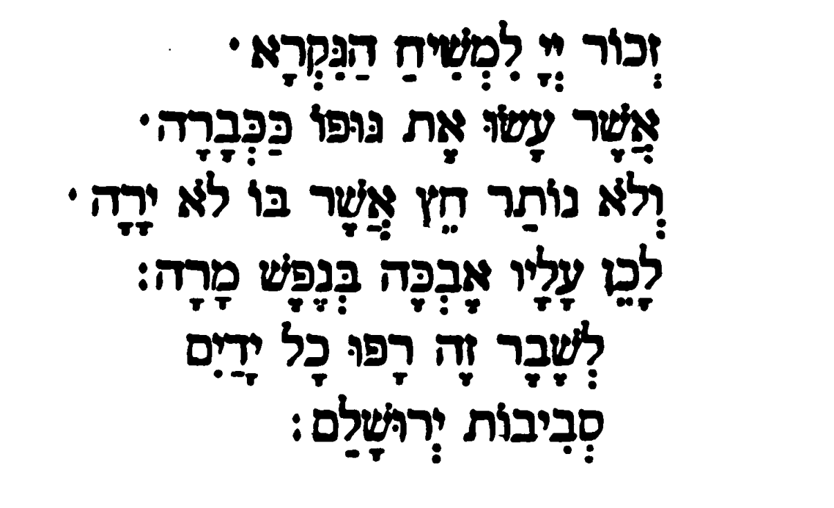 כְּשֵׁם שֶׁמֹּשֶׁה מַרְגָּלִיּוֹת שָׁמַע פַּעַם אֶת הַקִּינוֹת לְיַד הַכֹּתֶל וְשָׁמַע בָּהֶן אֶת הֵד סֵבֶל הַמָּשִׁיחַ — עֲזֹר לָנוּ לְהָבִין אֶת קִרְבַת יֵשׁוּעַ אַף בְּאֵבְלֵנוּ.