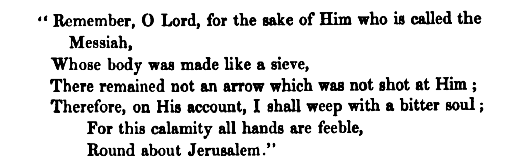 On his return to he found the prayer in the Liturgy of the Spanish Synagogue for Tisha B’Av – and recognised the Messianic allusions to Yeshua and his sufferings.